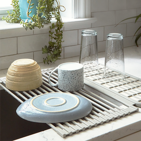 Our home editor, Lydia, loves that this small-space-friendly dish rack dries in 60 seconds—and you were convinced to go in on it, too. If you have a similarly hued countertop, it practically disappears.