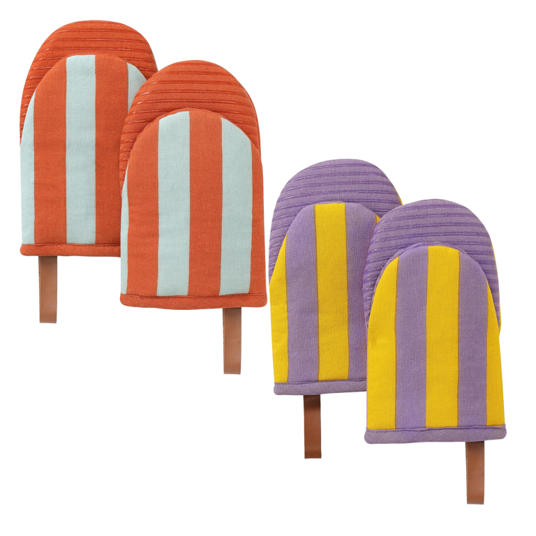 This set of oven mitts was made to be seen. The mini pot holders come equipped with a leather loop to hang neatly from a cabinet knob or wall hook, preferably near an oven. Because while the stripy pair—Domino readers and editors alike are equally fond of both the purple-on-yellow and orange and turquoise color combos—makes for cute kitchen decor, the inside of these gloves is covered in silicone for heat-resistant transport of hot dishes up to 500 degrees Fahrenheit.
