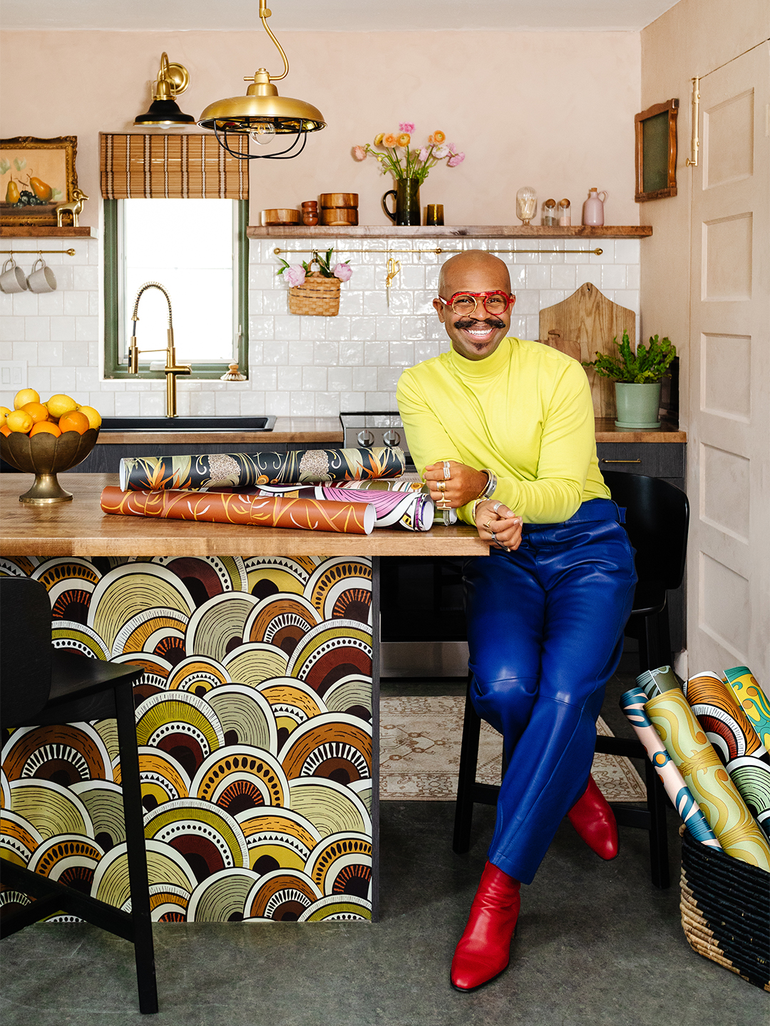 Especially in apartments, most kitchen islands are covered in a coat of “landlord white” paint, usually in a flat finish that shows every scuff. Quarles has a solution for that: “Peel-and-stick wallpaper has that kind of shiny texture to it where you can wipe it down,” he says. It’s also a fun way to add low-commitment color.