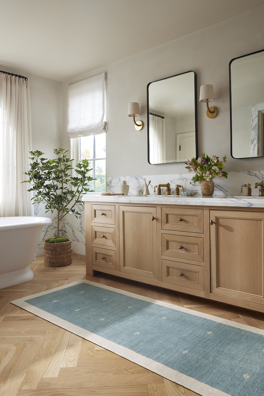 Seeing the Luna Soft Teal Tufted Rug (in runner form) styled in a bathroom has been one of the more surprising ideas Pinckney has come across since the collection launched.