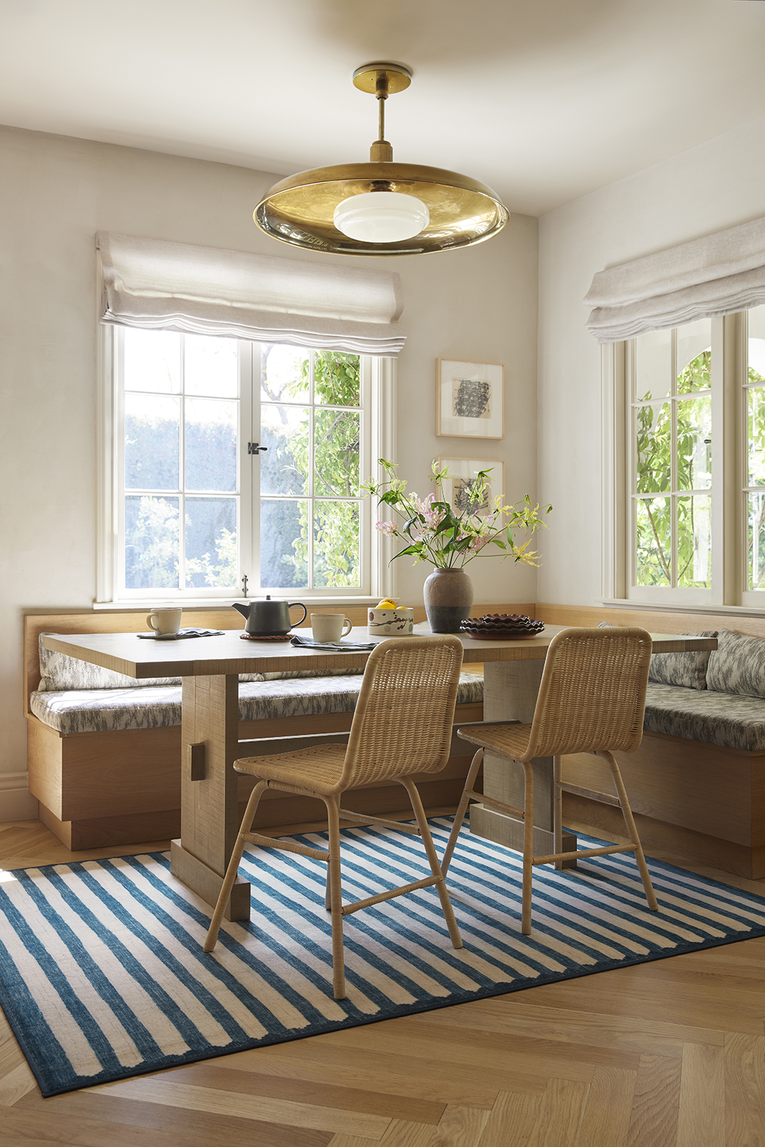 What do you get when you pair rattan dining chairs, the Elin Stripe Indigo Tufted Rug, and Roman and Williams’s burnished brass Oscar light? A dining nook with nautical vibes—but not in a cheesy way.