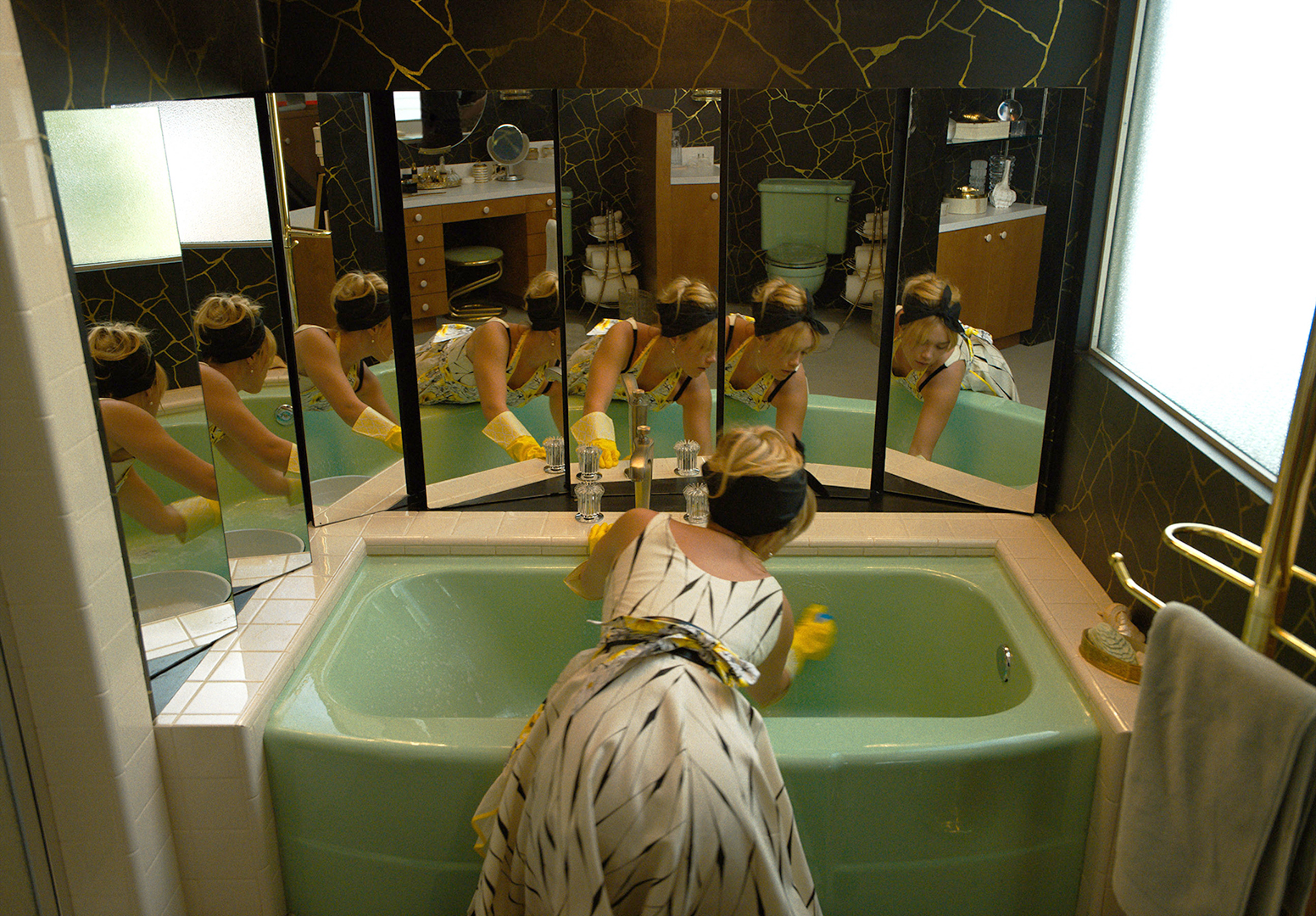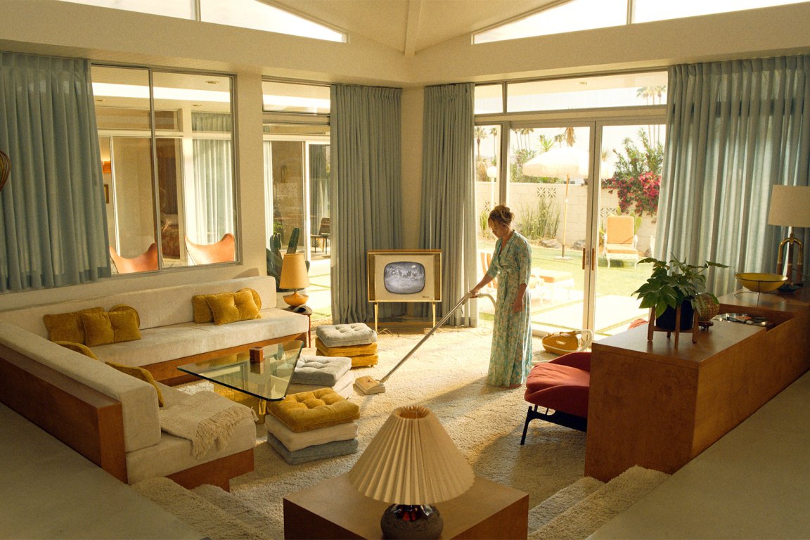 Among the unrelenting gossip and messy he-said-she-said narratives surrounding Olivia Wilde’s feature film Don’t Worry Darling, there is a singular diamond in the rough: the movie itself. Don’t worry (pun intended), we’re not rebranding as a film-reviewing platform; we’re more focused on how it looks. Upon arriving in Wilde’s made-up realm, Victory, viewers are met with a 1950s dreamscape: Mid-century modern homes decorate the sunny desert landscape while beautifully dressed women tend to their houses—cleaning with retro appliances and sipping martinis out of mod glassware. Most of the film is captured within the confines of Jack (played by Harry Styles) and Alice’s (Florence Pugh) pristine abode, and even though their sunken living room had us feeling nostalgic, the bathroom wallpaper is what really caught our eye.