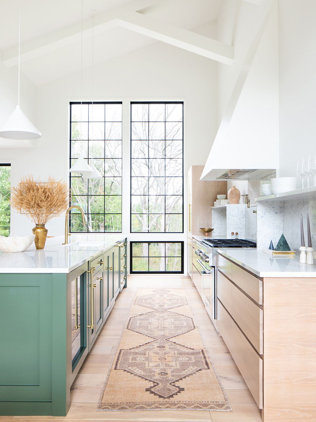 The problem with having a ton of picture and stationary windows is ensuring airflow. Liz Hoekzema of KLH Custom Homes incorporated vertically split windows in this kitchen, closer to the floor level, that can be opened and allow for a natural breeze. No compromises were made in spotlighting the Michigan home’s lush backyard.