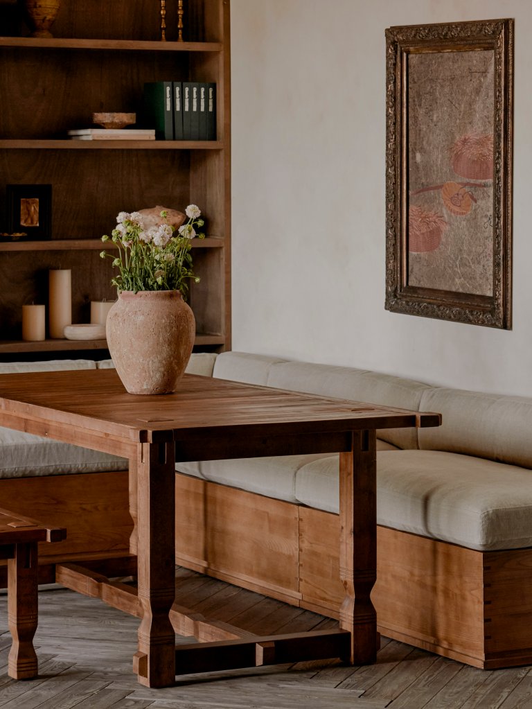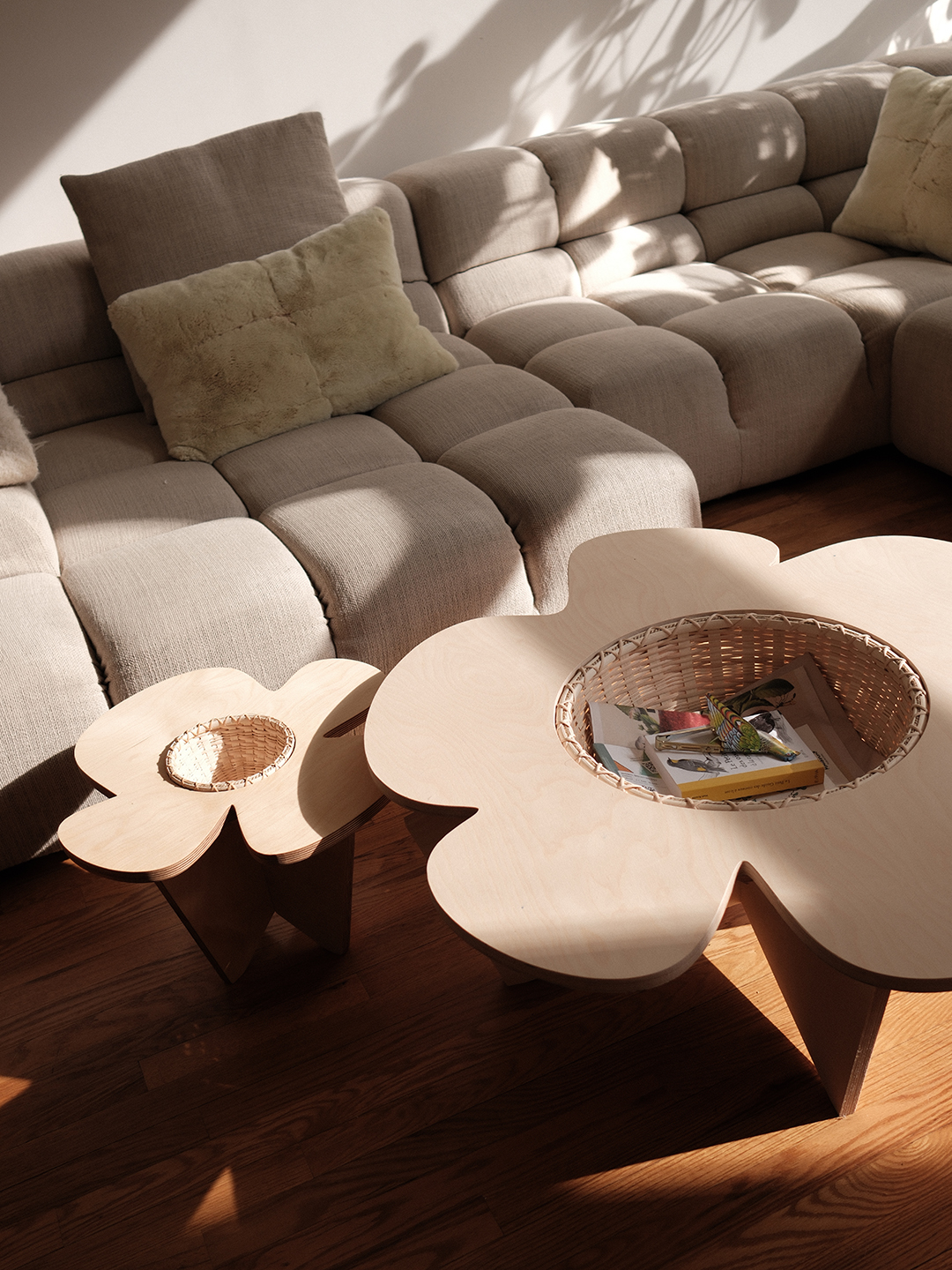 You can transform the larger table in a matter of seconds: it comes with a wooden lid that turns the inset basket into hidden storage, creating a flat surface. “It works beautifully as a coffee table—roomy enough for a bouquet, a sculptural ceramic piece, or even an ice bucket and glasses for an impromptu home bar,” says Rosseel. “During the day, it easily transforms into a play table—just add a few floor cushions for the little ones to gather around.”