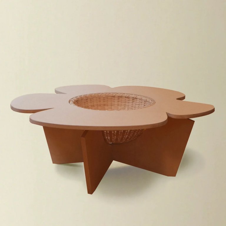 The New York-based brands, both known for their intentional approach to design, created floral-shaped nesting tables that combine whimsy and functionality, along with a mini rocker with a basket attachment, a toy caddy, and a stool with an optional cut-out center. Launching on May 28, the new collection—dubbed Loves Me, Loves Me Not—includes two flower tables: the “un peu” (a smaller version priced at $570) and the “beaucoup” ($1,150) in a natural-finished birch plywood in the shape of abstract daisies. At the heart of each piece is an Underwater Weaving Studio basket resting in the center, inviting in a tactile charm and usefulness—whether you have little ones or not.