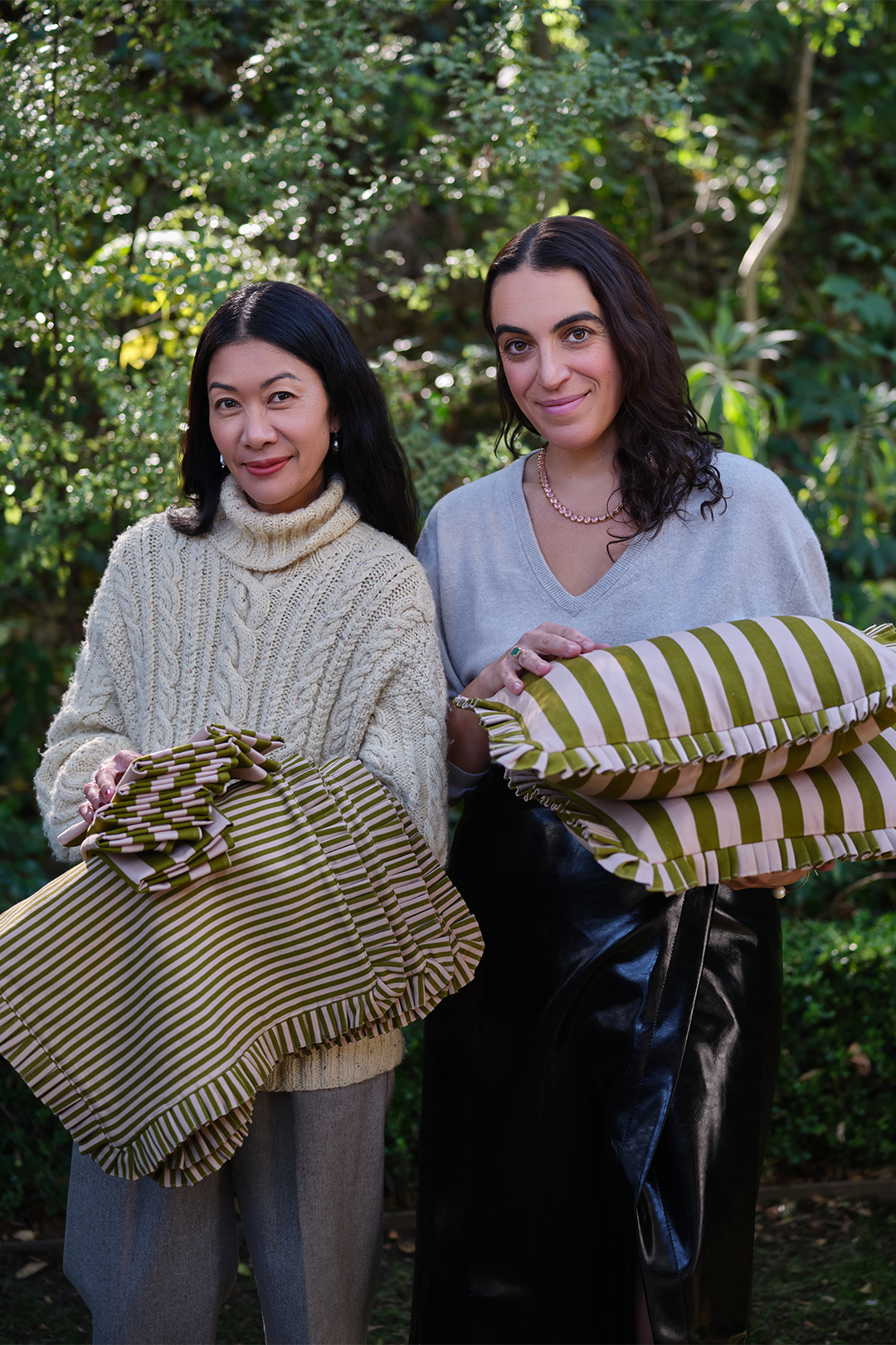 If you like to play at the table (and we don’t mean with your food), then this exclusive drop is for you. The products come in three varying colorways (oat and moss, lilac and pomegranate, and lilac and moss), three varying stripe widths (mini, medium, and wide), and, in the case of the placemats, with a pleated or scalloped trim. “Putting our editor hat on, we wanted to see: How many stories can we tell within different styles of homes?” says Berry. The combinations are practically endless.