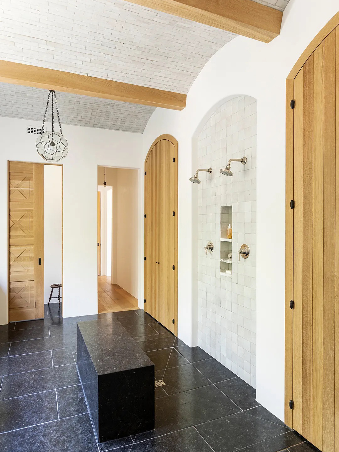 Wet rooms can be intimate, but this one in South Carolina provides a lesson in making the most of serious square footage with a double showerhead, a bench roomy enough for two, and a supertall vaulted ceiling.