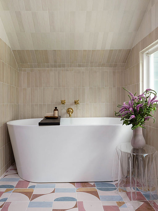 Tile continues up the ceiling and above the freestanding tub to create an extra-cozy feel here, in a lighter color that prevents the gabled roof from appearing too closed in.