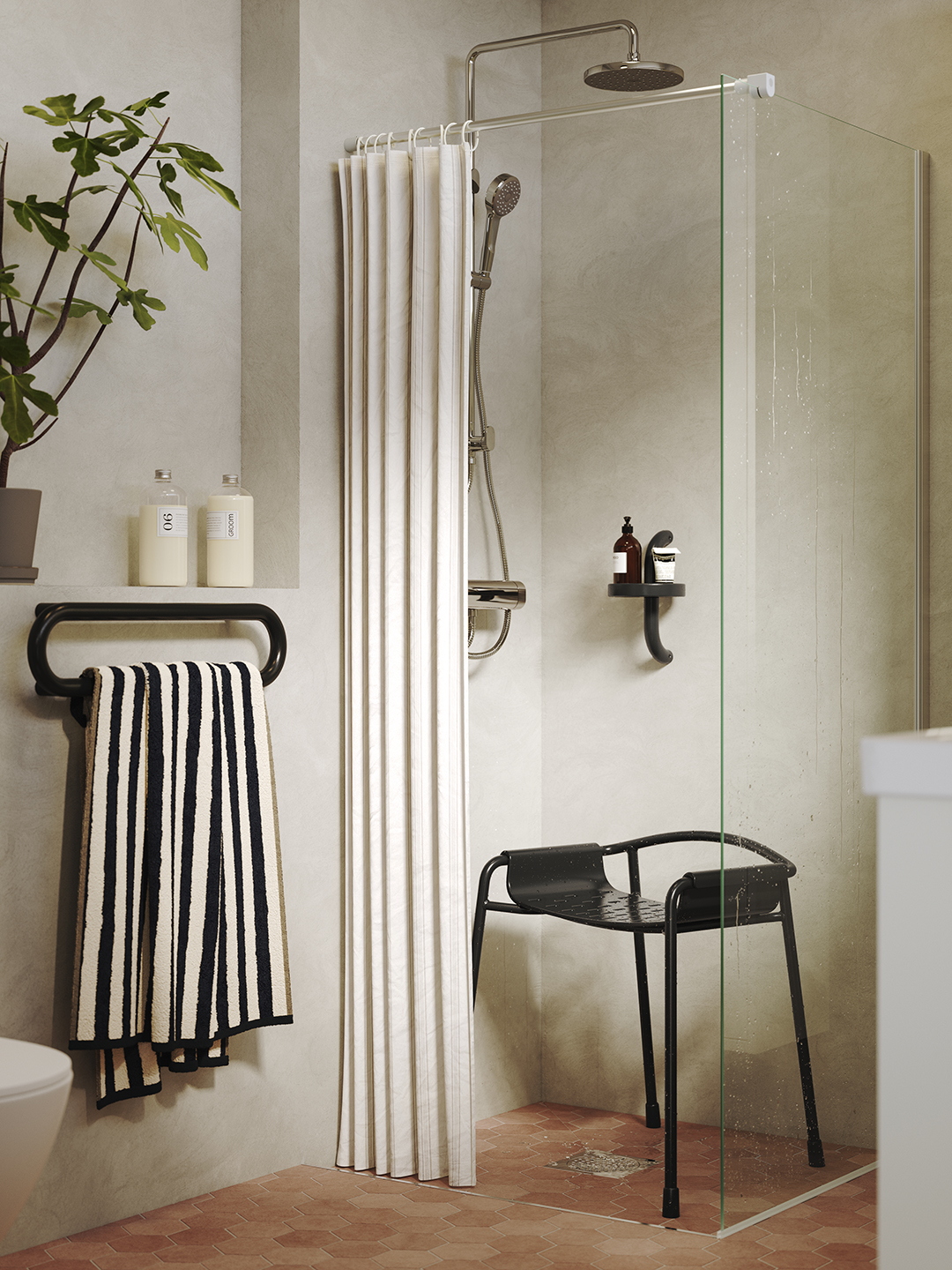 Primarily focused on making the bathroom a more accessible space, the line includes two different step stools with a rail, a shower stool, a toilet roll holder, a towel rail, and a shower shelf. In true IKEA form, the colors and silhouettes are rooted in minimalist Scandinavian design, but with an extra functional touch: they are sturdy and have non-slip feet, plus holes for water drainage. The edges of the tubular frames are thick enough for a comfortable grip, allowing people to support themselves while moving around.