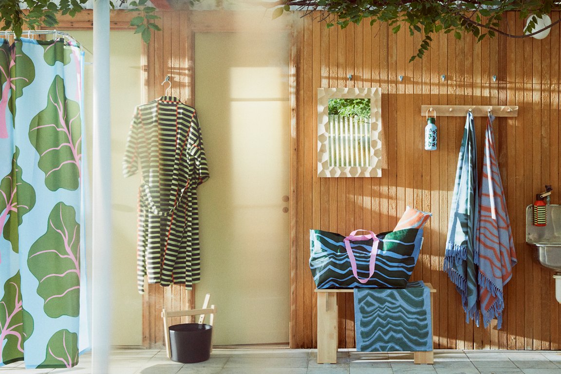 To her point, the Marimekko prints appear throughout the collection—on a shower curtain, robes, towels, trays, bags, and even water bottles (a sauna essential). Small tables, candles, glassware, and a bucket with a ladle complete the self-care vibe.