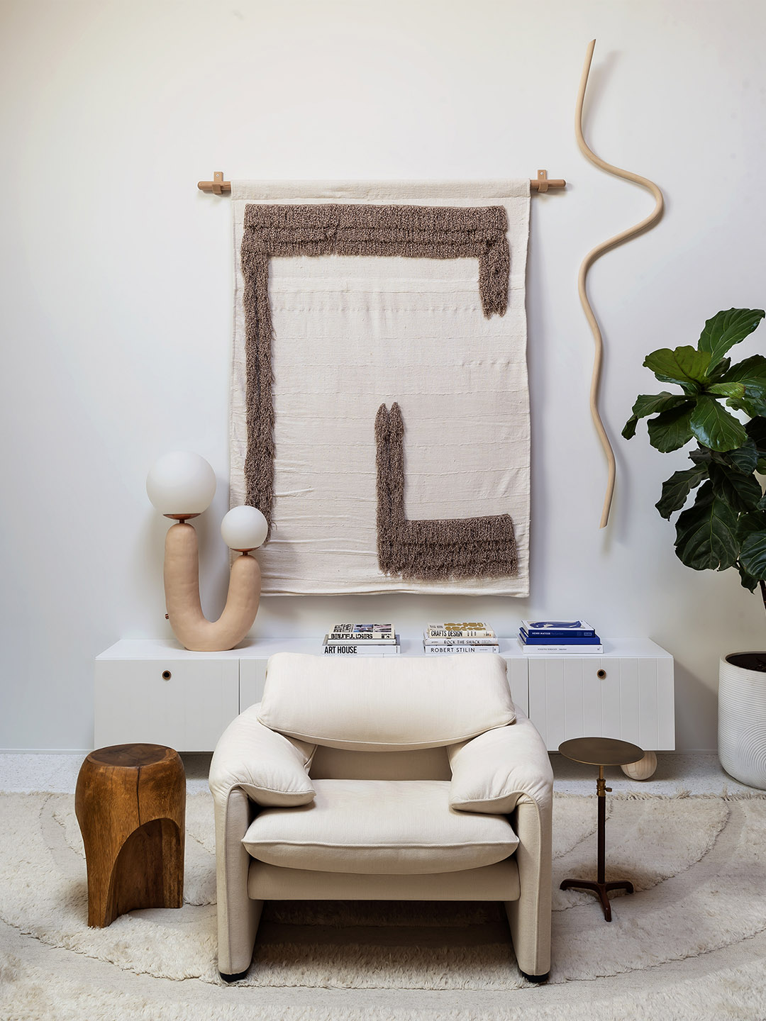 Sarah Sherman Samuel‘s cabinet may appear to sit on the ground, but it’s actually wall-mounted using suspension rails. The designer modified the look by attaching flattened wood balls to the bottom of the units, using an orbital sander for precision so they look like proper feet.