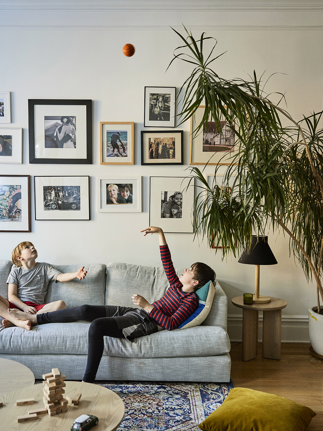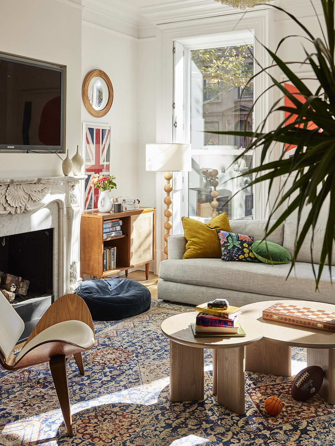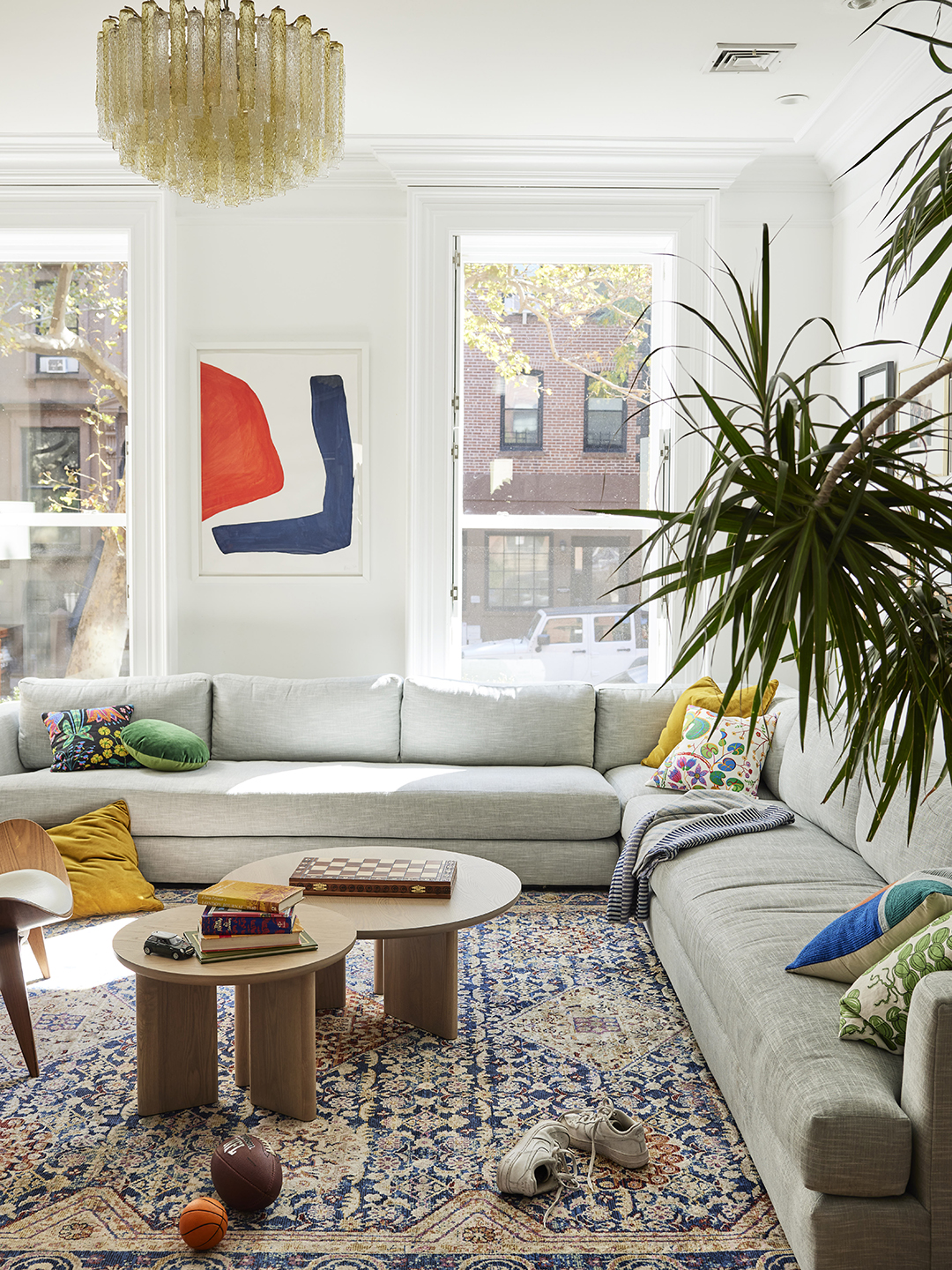 Her actual living room in Brooklyn isn’t all too different—a giant L-shaped sofa frames the space where her two preteen boys lounge with their friends. “Giant shoes and socks are scattered around our house, which I love,” she says. It’s also where they’ll gather to order pizza and play games (more on their current favorite in a moment). And it’s where they’re currently rewatching Derry Girls. Here’s everything Goddard says makes her living room a place where everyone wants to gather.