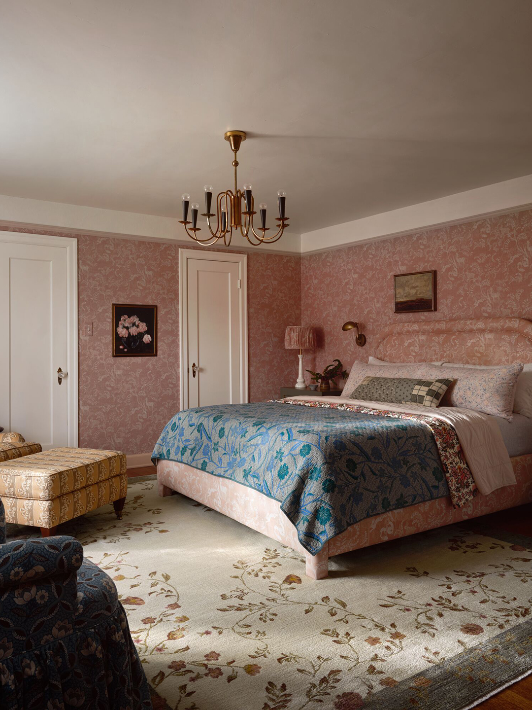 “I think a mistake people often make is that they get a rug that’s too small for their space. It instantly makes the furniture look awkward. My general rule is to go bigger versus smaller. A bed should definitely sit on [a rug] and both sides should come and spill over past the nightstands (but I like for the rug to sit in front of the nightstands).”