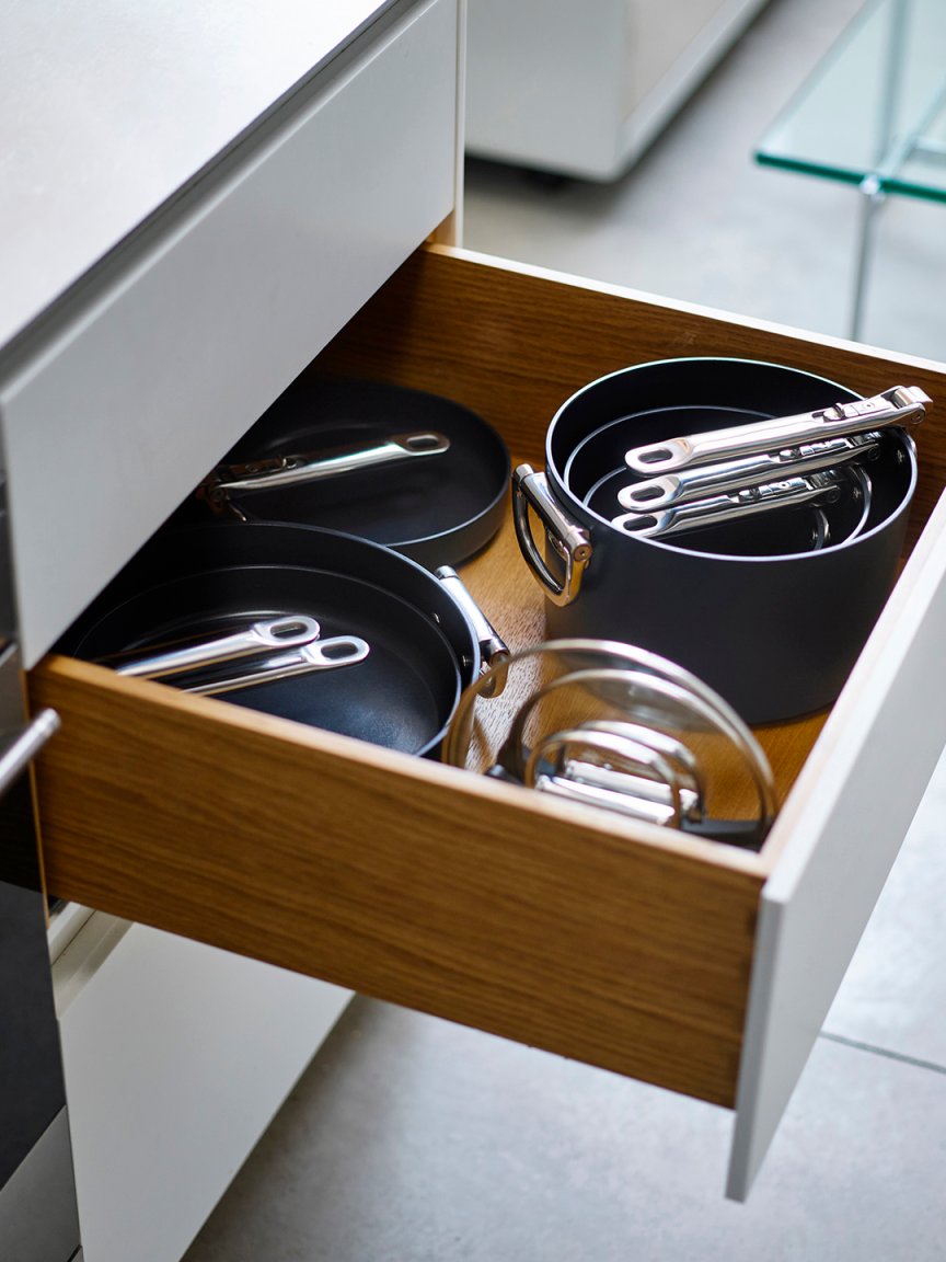 When you take the handle out of the equation, cookware is basically just a vessel. And that’s what Joseph Joseph did, using SwingLock technology that allows each one to invert when it’s not in use; all you do is pull a tab on the underside of the handle and it folds 180 degrees. It feels like a magic trick every time. The opposite support and lid handle also fold in so then there’s truly nothing sticking out. When your kitchen is as small as mine, even 2 inches can make a huge difference, so these minor features go a long way.