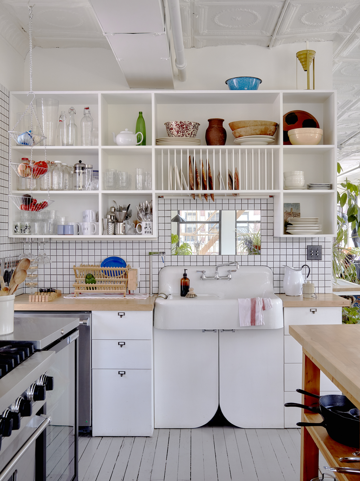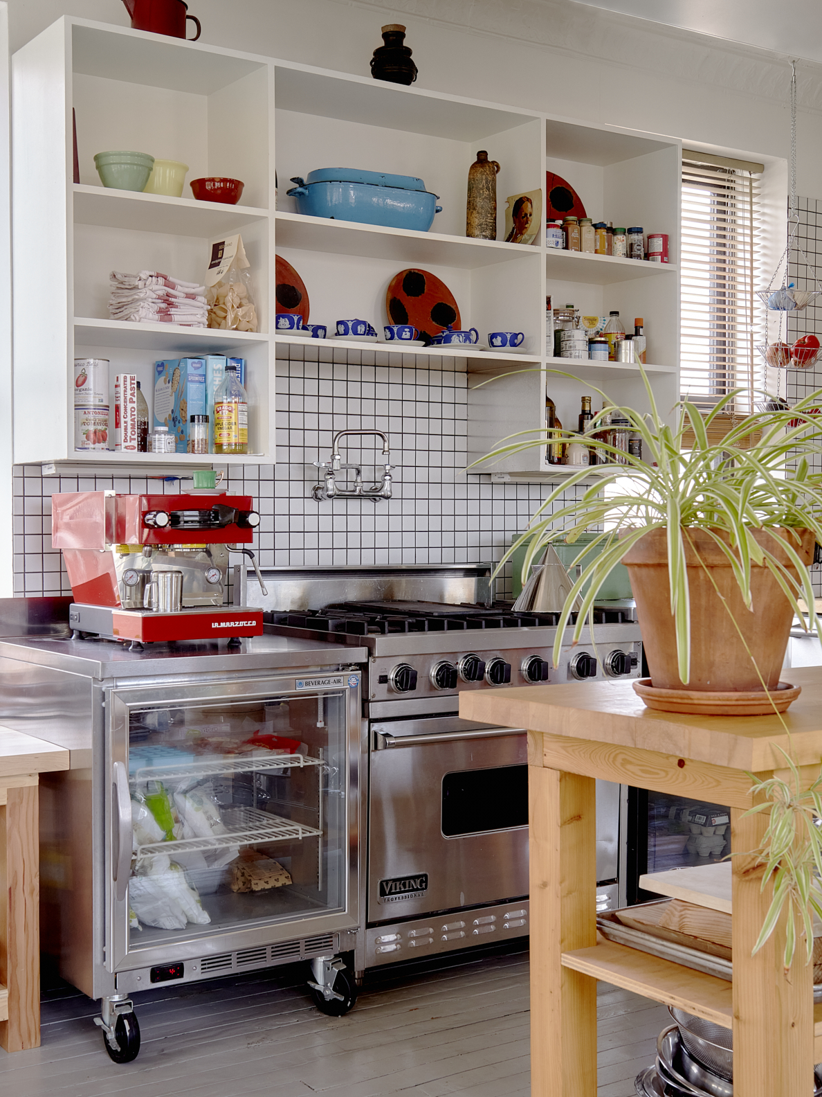 The beauty of concealed storage is that you can tuck away less attractive items. But in this type of kitchen, it’s all about open shelving. That means no plastic mixing bowls and ironic mugs, unless that’s really what you’re into. Think: a classic Chemex, enamel serveware, and a Spanish oil pitcher.