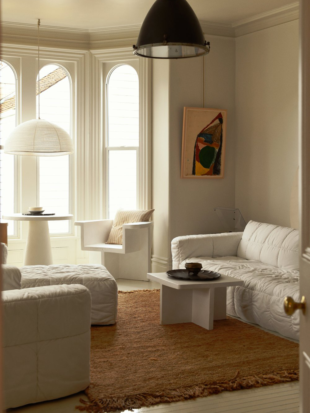 Of course Ford put her marshmallowy Mellow chair and slipcovered sofa in the living room, with a vintage light fixture above to add a bit of contrast.