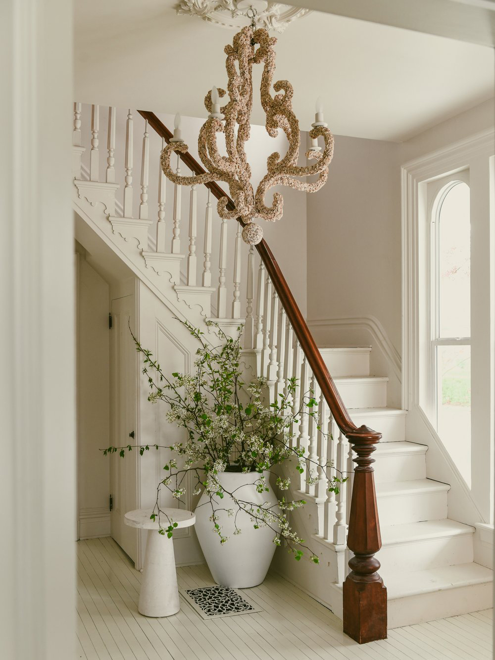 Ford filled the home in her signature white-on-white color palette (the walls and floors are Shoji White by Sherwin-Williams), which means it can almost be tricky to spot the plaster pedestal side table she placed below the stairs. The seashell chandelier, however, is on full display.