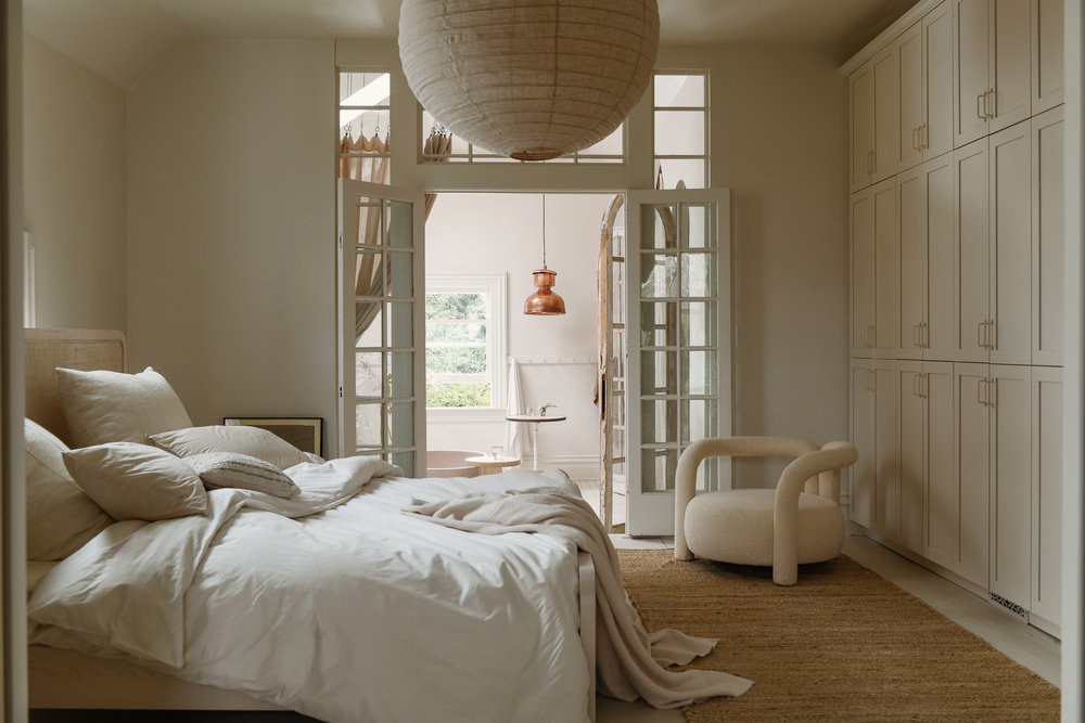 In the sleeping space, Ford made things extra serene with a Noguchi lamp and bouclé seating too pretty to become a “clothes chair.”