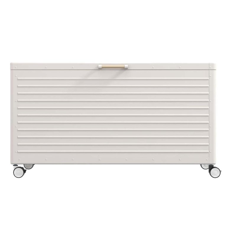 From an aesthetic perspective, the Mirador outdoor deck box nails it: a delightfully minimalist metal exterior in either a charcoal or creamy latte finish; a handsome wood handle; and matching, lockable wheels.