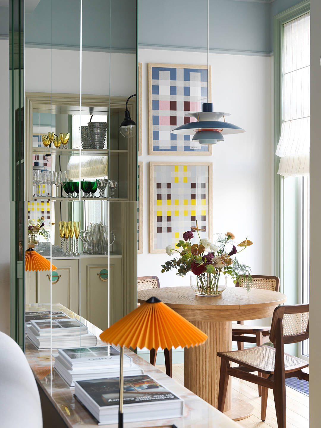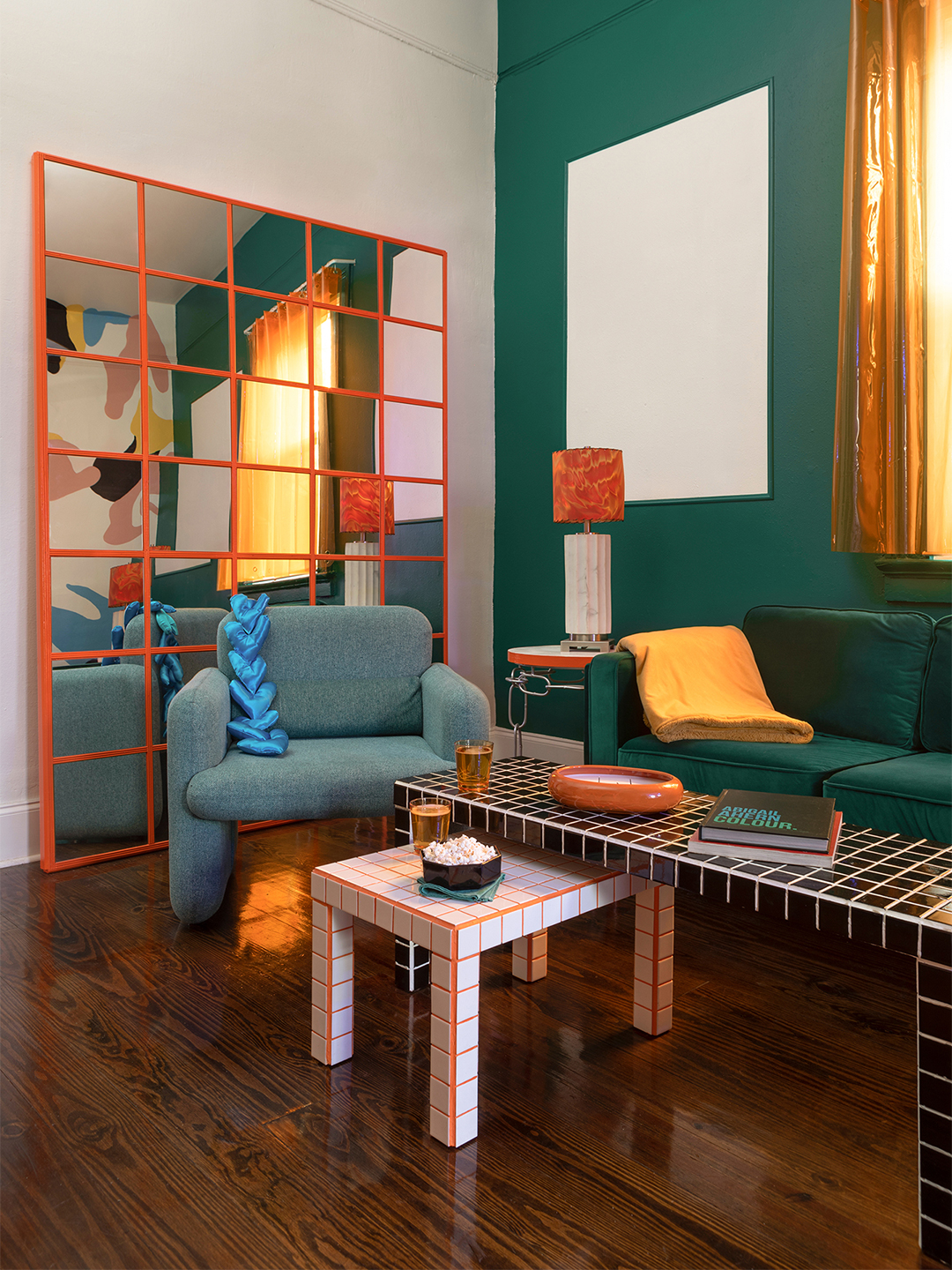 Jassy’s New Orleans home is a master class in fully committing—the double shotgun is saturated with curated chaos, color, and custom creations. But the real lesson is actually for those not ready to go all the way with this trend. In the living room, he leaned an extra-large mirror against the wall (it’s so big it looks like one with the house) and gave it a gridlike effect with Nickelodeon-orange tape. Should he ever tire of it, he can easily pick it up and move it.