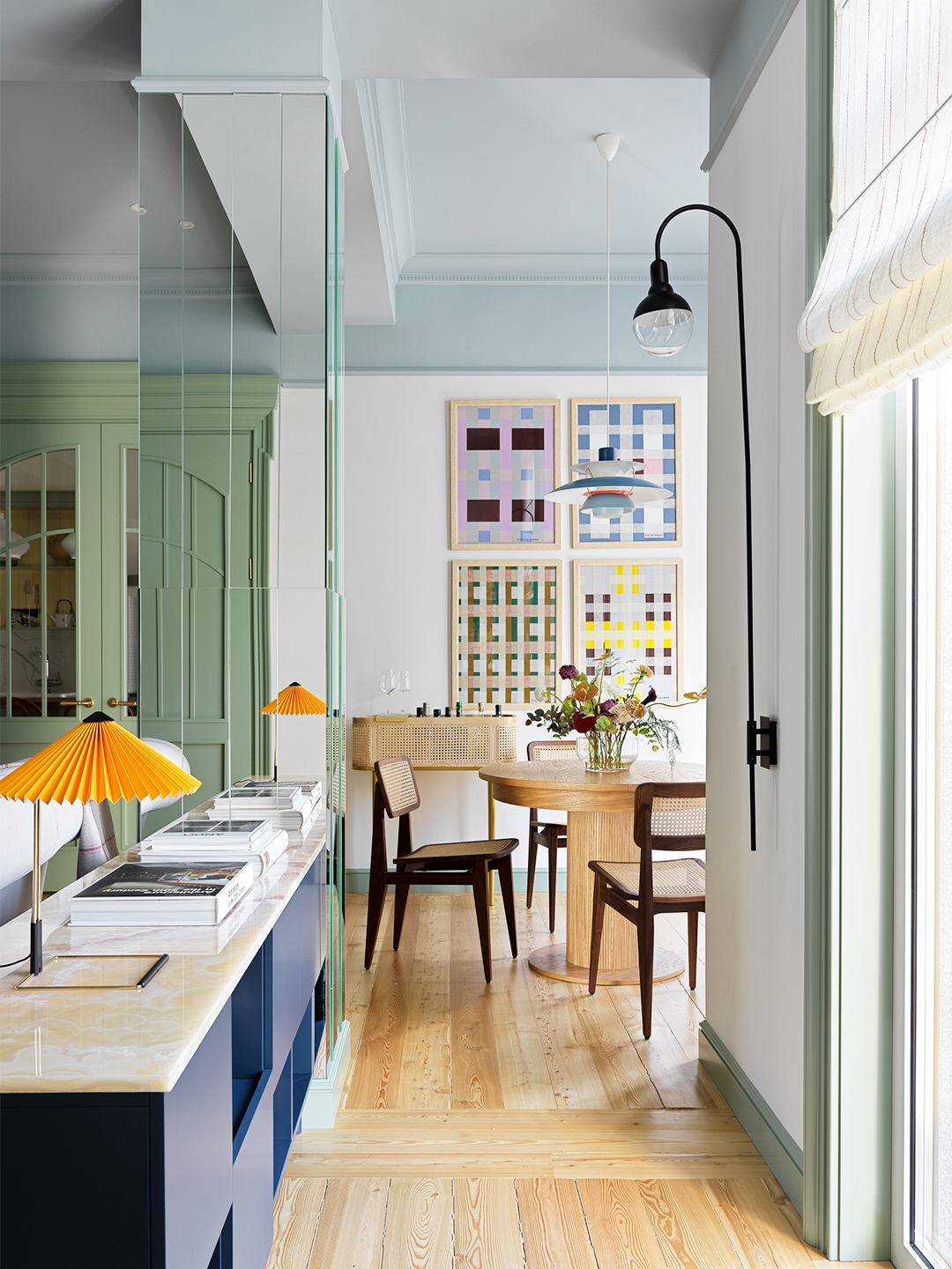 When an unsightly load-bearing column presented a challenge for Elina Mussakulova’s vision for this Kazakhstan apartment, the designer’s response was to wrap the structure in mirrors. Instead of the kind you might find in an oversize chain restaurant, she covered it in long, rectangular strips to give it a sculptural element—a solution that deserves a moment of reflection.