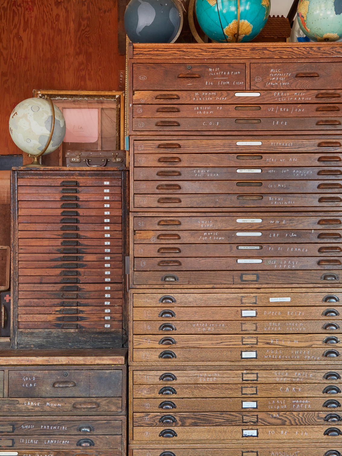 Biggest splurge that was worth it: I have two enormous sets of wood flat files. One of them was (again) found discarded nearby. When I began to run out of drawers, I started looking for another and found an older, even more beautiful set that had recently been restored. I couldn’t resist.