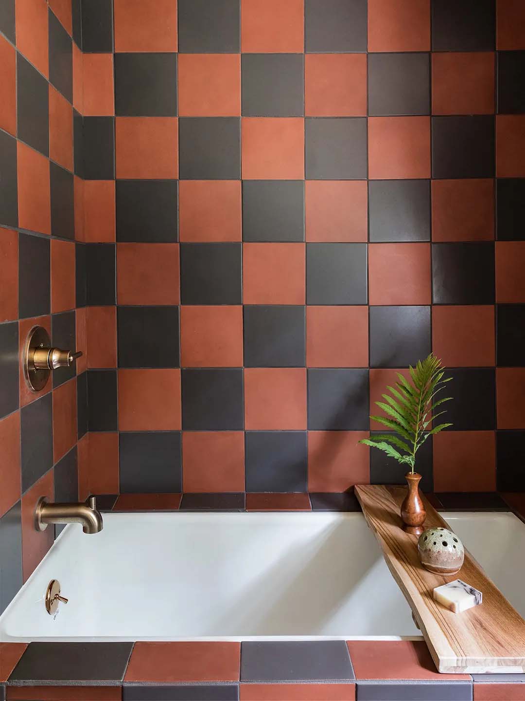 As this pine cabin in Brunswick, Maine, proves, there’s a whole spectrum of red to consider, and the most dramatic shades are just the tip of the color iceberg. Here, the homeowner’s use of rust-colored checkerboard tile works together with polished brass hardware and touches of wood to create an Alpine spa–like feel.