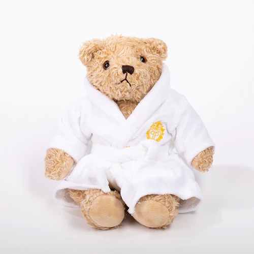 An ultraplush robe is a crucial addition to any bathroom space vying for status as an en suite oasis. The golden glow from a wiggly mirror and a shining countertop tray give you a place to powder your nose and set your Chanel No. 5 after a spritz. Meanwhile, an Italian leather dopp kit keeps travel-size essentials at the ready for when you jet off for a weekend stay in your favorite penthouse, of course.