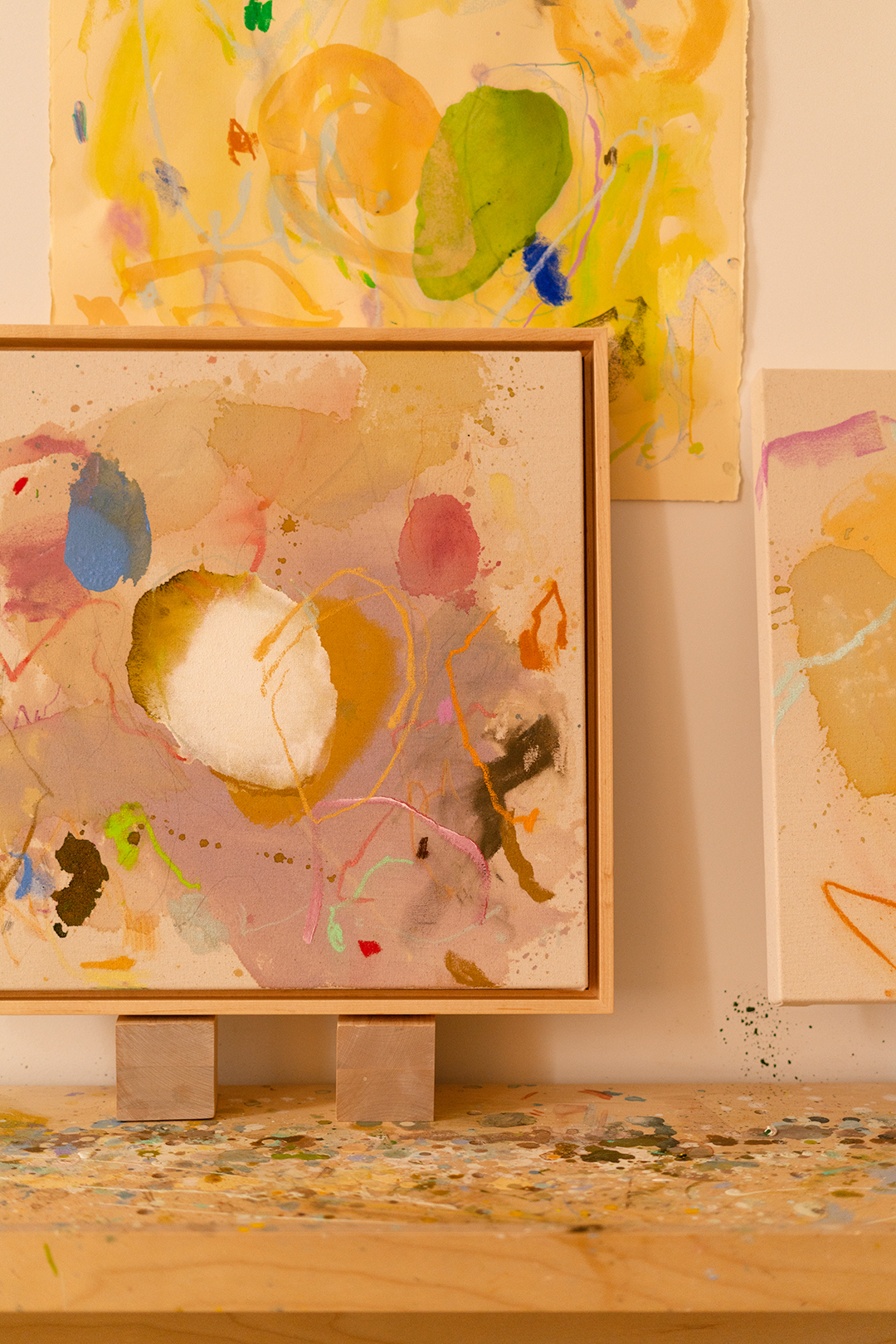What’s on the walls: Paintings in various stages of completion. I just finished up my next Nest series, which is probably the series I’ve been painting the longest. It’s about the messiness of home.