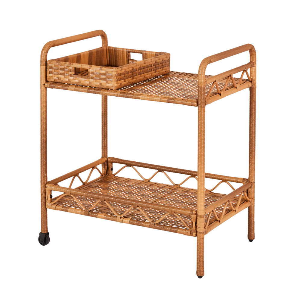 Nothing embodies the ’70s like a poolside soiree. If you’re looking to throw one yourself, you’ll need a retro-style bar cart—made of wicker, of course. This one’s matching tray makes taking your cocktail fixings from trolley to table that much easier.