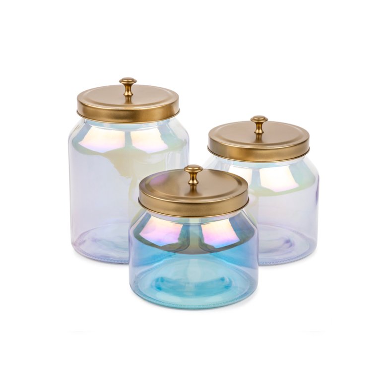 In channeling the hippie era, irridescent decor never fails. Use this trio of jars for cotton balls and floss in the bathroom or your coffee setup in the kitchen.