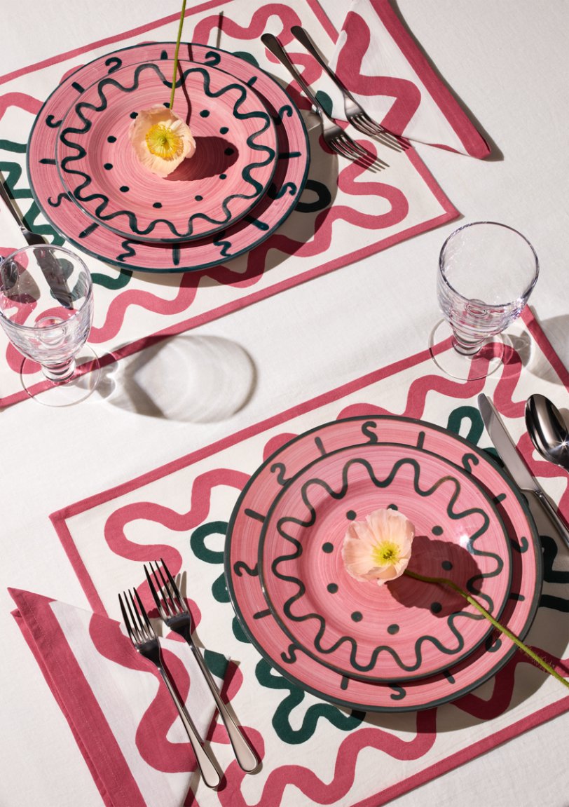 Rhode’s signature wavy motif makes another appearance, this time in red, and pops against the richly hued Blue Sicilia print reminiscent of Italian mosaics. Go matchy-matchy with table linens in the same style or mix it up with one of the other limited-edition designs to really set it off.