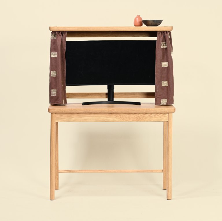A two-tiered design makes it possible to tuck away your monitor behind the desk’s curtain when 5p.m. rolls around, so all you see is your enviable ceramics collection up top.