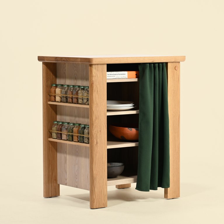 About half the length of the Hearth island, this mini version has the same towel rod and optional spice rack but a simpler four-shelf interior.