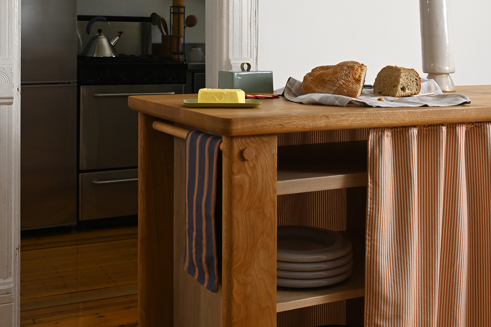 Betesh and Steigmann’s very first design was the fix for their kitchen conundrum: a freestanding island with a butcher-block top (for food prep) and built-in curtains (for storing pots, pans, and spices out of sight). “That piece became the seed for a collection meant to bring a sense of home to your daily rhythm,” they share.