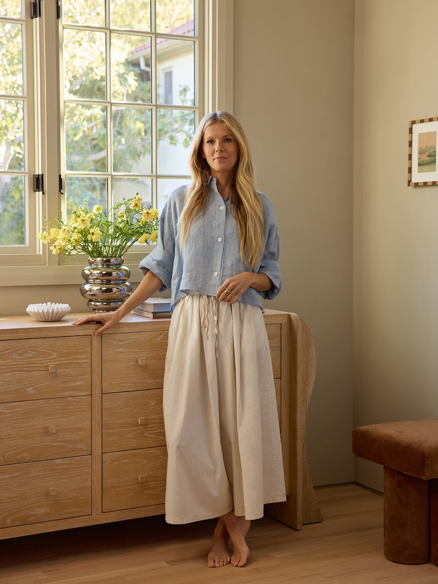 A centerpiece of the collection is the iron and upholstered canopy bed—a style that’s topping homeowners’ wish lists this year, according to a recent report. Samuel says she envisioned a modern interpretation of the traditional form, opting for a pared-back frame but exaggerating the curves of the upholstered headboard. “In my mind, it’s a little Louis XV meets Bauhaus,” she adds. Her styling rec? Keep the bedding minimal— just two pillows tucked under a coverlet. If you’re looking to customize—and create a cozy, cocooning effect—Samuel suggests hanging drapery panels.