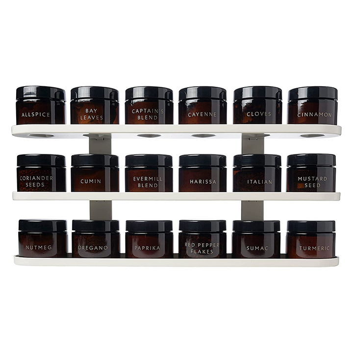 We mounted our spices right above the oven so they’re always out of the way. More important, the uniform jars by Evermill automatically make things look less cluttered.