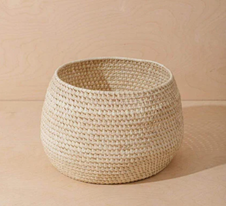 I love baskets that are both functional and aesthetically pleasing. We keep one of these containers, crafted in Mexico from palm fiber, in the living room for all our blankets.