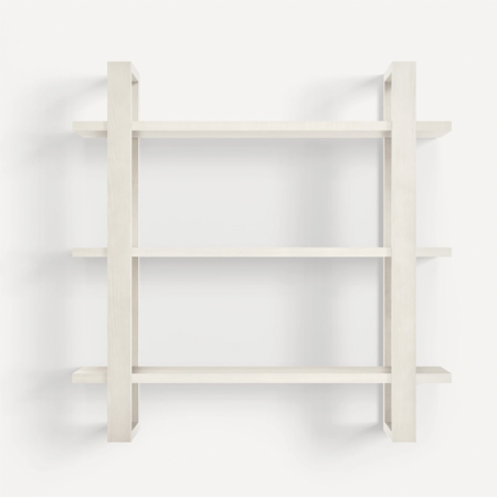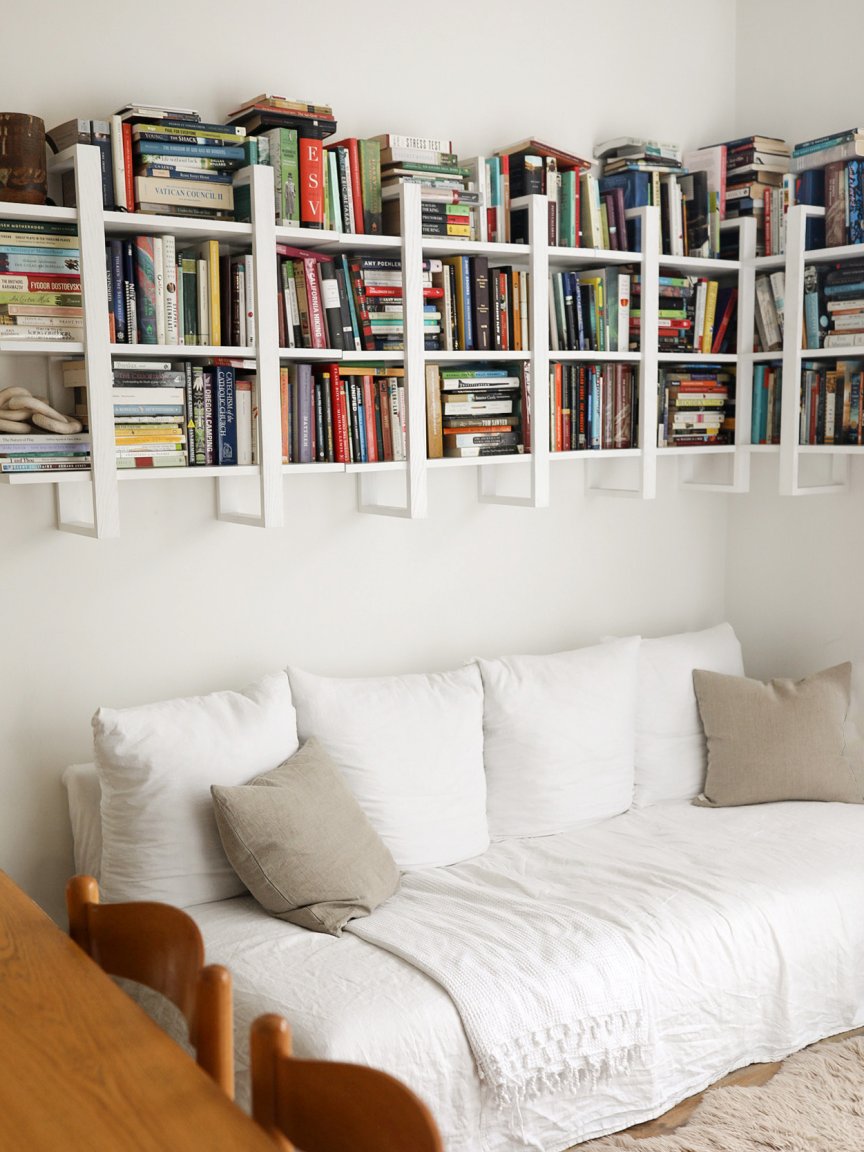 My husband is an avid reader, so we weren’t going to get rid of any books when we moved. I love that Burrow’s shelves (we bought four of them) are modular. We originally had plans to mount them in a row, but the electrical panel is in the most awkward place ever, throwing off our idea. We ended up putting one of the units on the other wall, creating an L-shape display.
