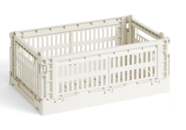 Having our girls share everything has served them well (they’re about 18 months apart, so they’re into the same toys). It also keeps stuff in their bedroom to a minimum. The items that they do play with live in four of these Hay crates, which we keep on their bookshelf when not in use. They’re stackable, so we could always buy more and take them all the way up to the ceiling if we need to.