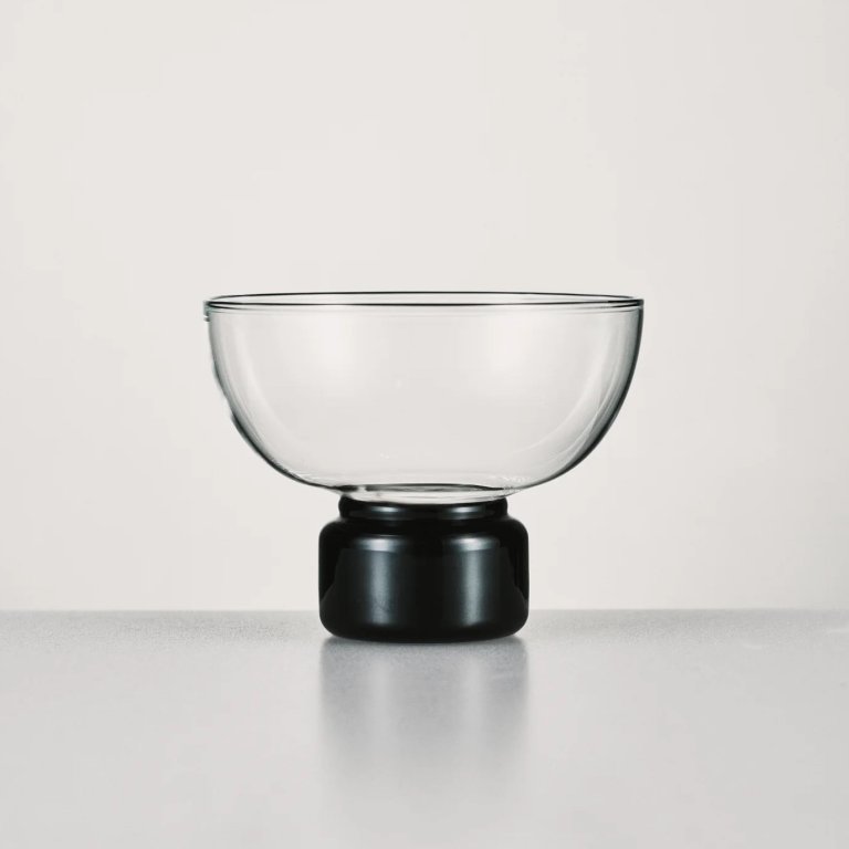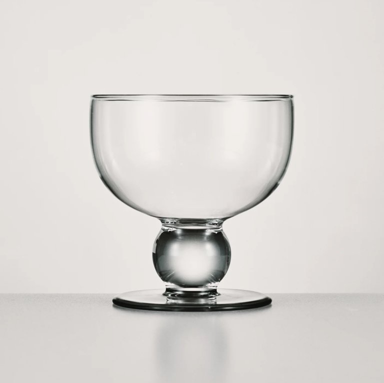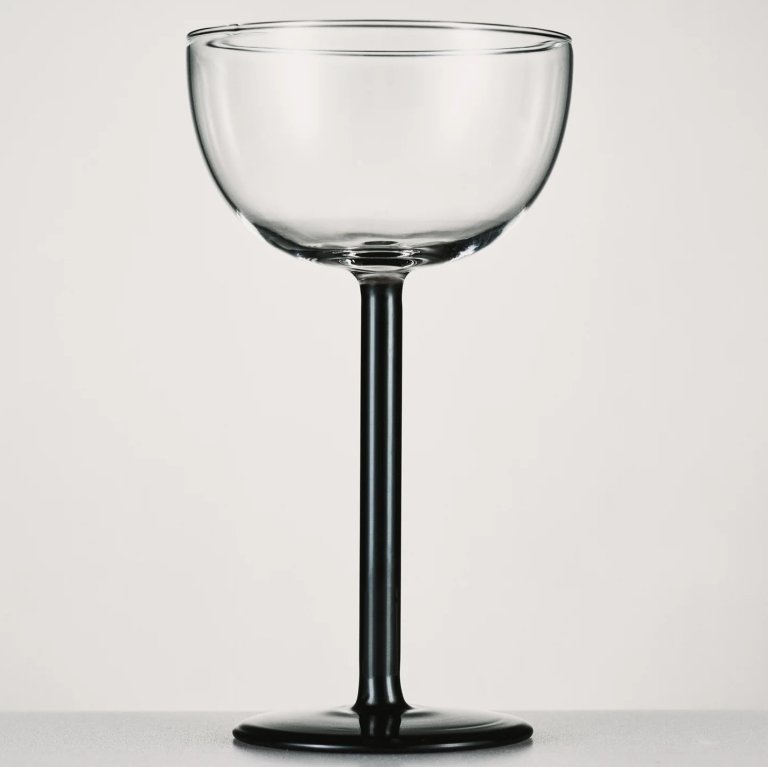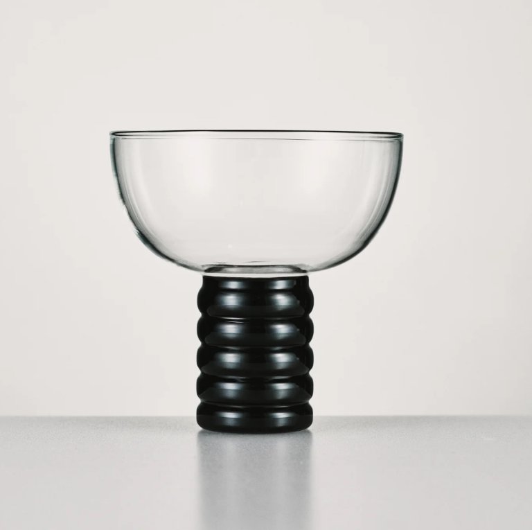 The four glasses in this line, which range from $37 to $45, are handmade from clear and onyx-colored borosilicate that can withstand hot and cold beverages. With silhouettes spanning from long-stemmed champagne glasses to squattier sculptural globes, we love the idea of mixing the shapes on a tablescape.