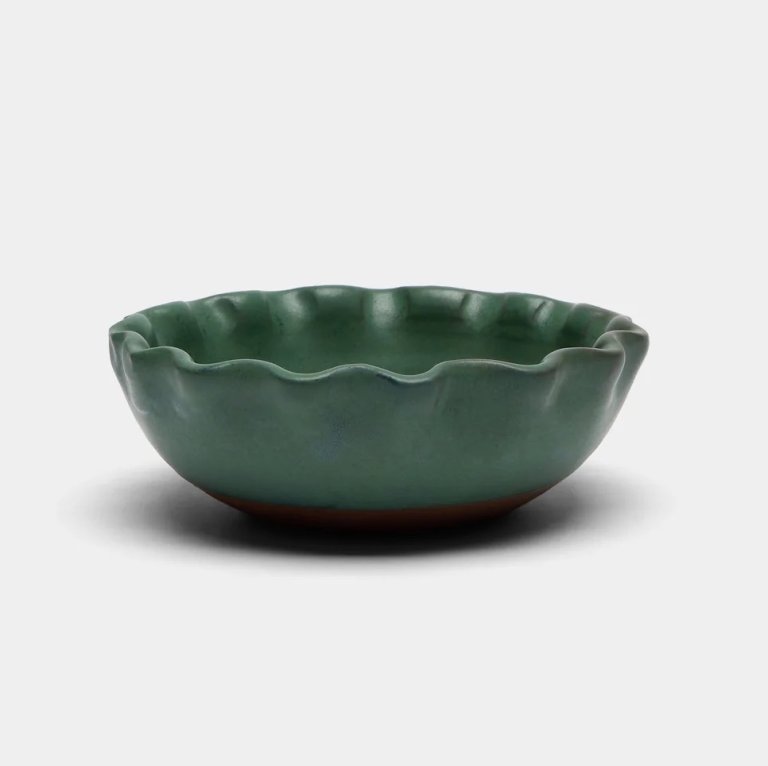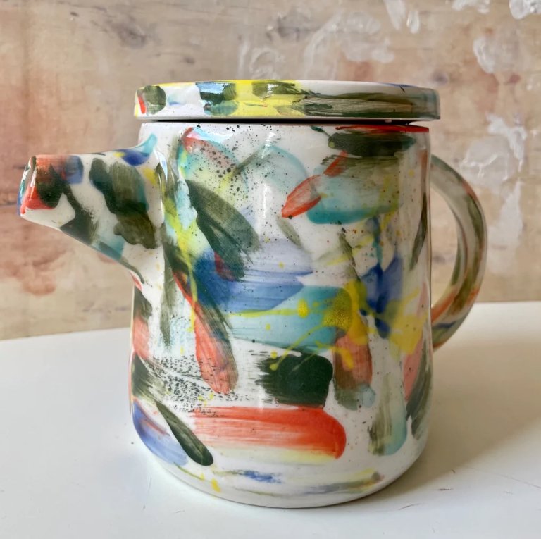 Then there’s Melina Kemph at Honey Lain, who doesn’t just make plates and bowls, she does things like olive oil cruets in this cool splattered glaze. And for glasses, you can find Estelle Colored Glass at West Elm in every shade.