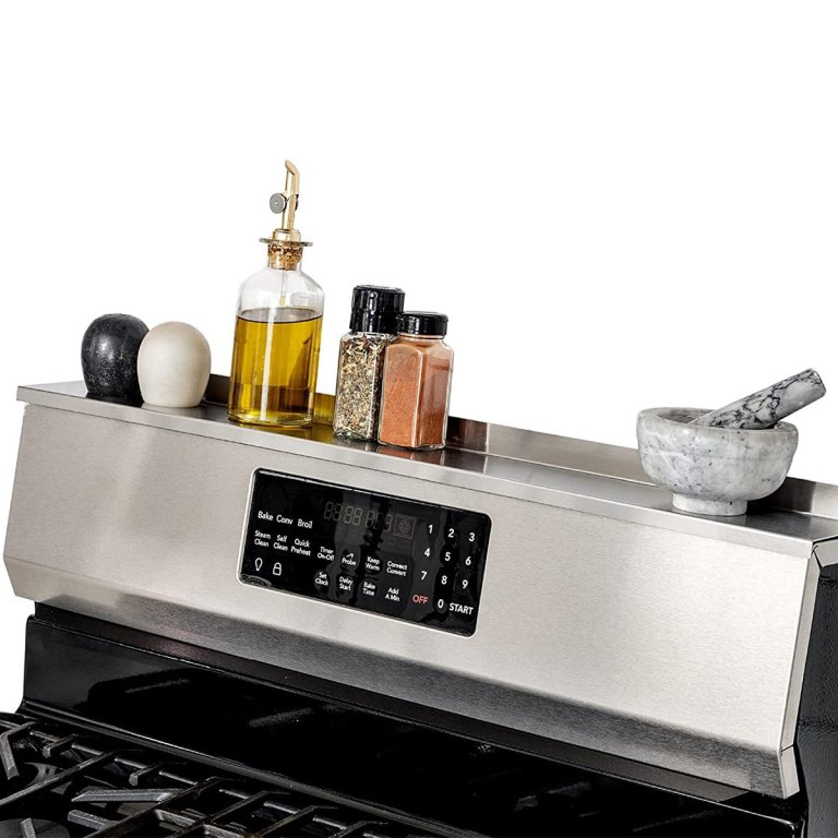 Here are the details, after months of testing one. First things first: The thing basically looks like an extension of my stove. If I didn’t tell you it was there, would you really notice it? It’s available in easy-to-clean, food-grade stainless steel or powder-coated white or black. Lengths of 20, 24, and 30 inches make it easy to fit one to even the most petite of ranges, and the 3 ½-inch depth is actually roomier than it looks. A Dansk butter warmer doesn’t tip off the edge, nor do my fancy salt and pepper grinders. I can even display an upright open cookbook (with the help of a weight). It stays put thanks to seriously powerful magnets that attach to the top of your stove’s display—that thing is not going anywhere. You can’t bump it out of place, but it’s not a chore to take it off when necessary. The backstop also keeps items from scuttling away through the gap between wall and stove. It’s ideal for a diminutive counter space or someone (me) who can’t say no to a 100th fancy ingredient. And now, I’m heading back to the kitchen.