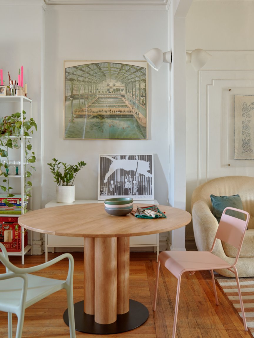 When my husband and I first moved in, we purchased a round dining table with a hollow metal pedestal that, depending on where it rested on our uneven floors, would send glasses shaking when you’d put your elbow down on the table. Typing on my laptop with anyone else at the table created a Morse code–like tapping on the floor. Still, we liked the central legs so that we could squeeze as many people around the table during game nights, and visually it was cleaner. We just needed something sturdier.