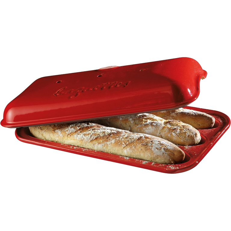 A burgundy baguette baker made of clay through proprietary manufacturing practices established in, you guessed it, 1860s France.