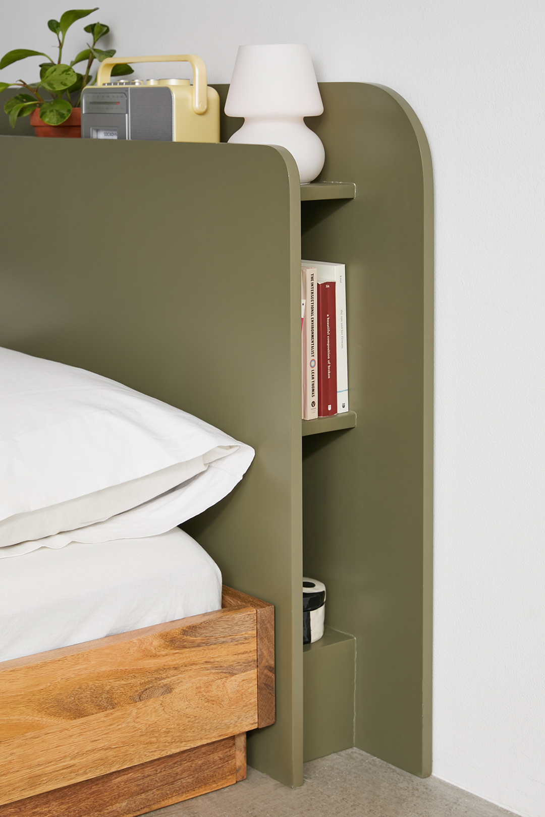 This headboard’s extended depth will conceal haphazard stacks of your “to-read” list thanks to two shelves hiding behind its curvaceous corners. Choose between a powder-coated white or olive green as the backdrop to all sorts of items, not just books. At top, there’s a roomy-enough ledge to slide in your evening glass of water and a phone, lamp, or box of jewelry, especially if there isn’t quite enough space to squeeze in a nightstand between the wall and whatever bed frame you have. Shop the rest of the Mod Future collection here.
