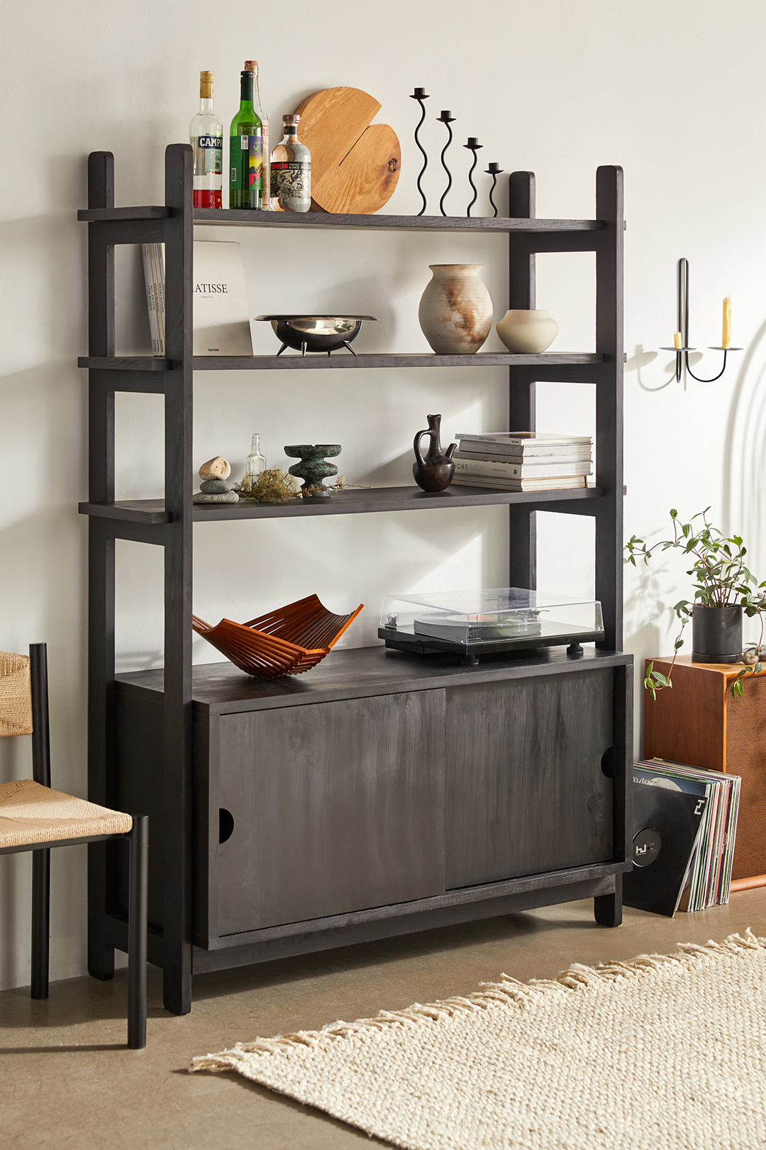 If you’re unsure about hiding everything away but aren’t fully committed to the idea of open shelving, middle ground can be found with the Alonzo Storage Hutch. A sleek, dark finish doesn’t conceal the natural wood grain, and the nubby legs and extended shelf design are chic touches. Above, style your most prize-worthy possessions (perhaps from that summer trip abroad?); below, slide the black-stained, flat-front pine doors shut to keep other items out of sight, out of mind. Shop the rest of the Self Loft collection here.