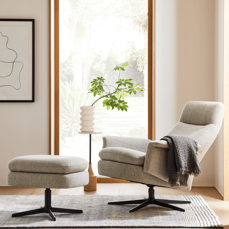 We were shocked to discover this cool, contemporary recliner on sale for a whopping 50% off its usual near-$2,000 price. The design features a kiln-dried wood frame with reinforced joinery, a 360-degree steel base with an antique-bronze finish, and (our favorite detail) a sleek silhouette with subtly flared armrests. While you can score the seat solo to use as a stylish laptop-on-knees chair, the matching ottoman is also marked down (39% off) and would make a fine complement to create an elevated reading nook.