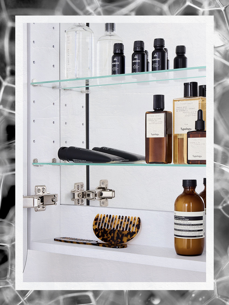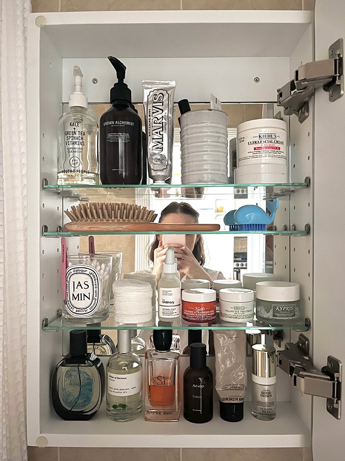 As it’s a fairly heavy piece, I left it to the professionals (aka a hired handyman) to drill into my bathroom tile and secure it. Another advantageous facet of the medicine cabinet is its adjustable glass shelves, which allow me to customize the storage space to support my skin-care and hair regimen: a shallow slot for small eye cream tubs and a hairbrush laid flat; taller sections for tumblers filled with makeup brushes and tubes. The cherry on top? A mirror-lined interior that makes my getting-ready process all the more convenient because I don’t need to close the cabinet in order to see my reflection. The whole vibe, both in fashion and function, is decidedly luxe—transforming the bathroom from itty-bitty to small but fancy.