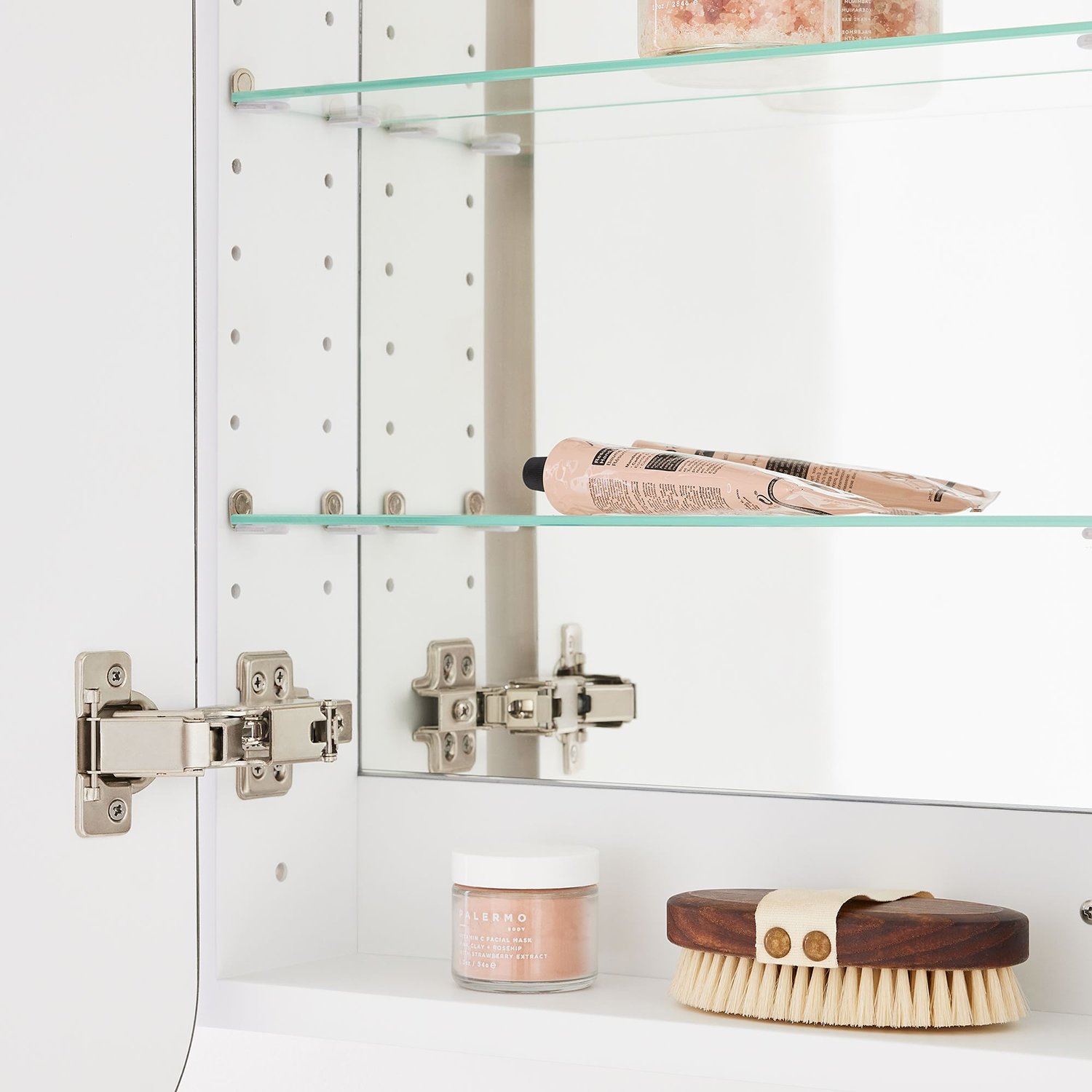 What ultimately set West Elm’s design apart from the other medicine cabinets I’d considered was the frame. I decided that its smooth, rounded edges would afford my sad beige-tiled bathroom a little more aesthetic oomph than a generic rectangle. While I’m a polished chrome girl all the way, the cabinet is offered in four other metals (antique brass, matte black, dark bronze, and brushed nickel) to suit a range of style preferences while also matching existing hardware or fixtures. There are two sizes (16.5-by-27.5 inches and 21-by-34 inches) available for all of the finishes, plus an additional length (60-by-24 inches) featuring three doors for the brass option. Naturally, I chose the smallest size.